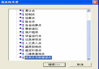 首先我們需要建立關係數據庫源點:進入點組態管理界麵新建一個點,選擇點類型為“關係數據庫源點”: