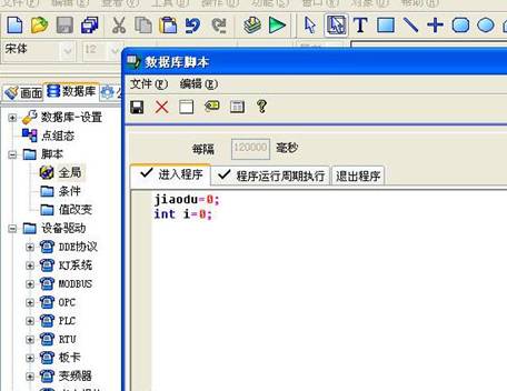- 在標簽“數據庫->腳本->全局->進入程序”裏,先把變量jiaodu和i賦值為0。