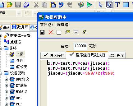 點test的PV值連接的是設備t的軋鋼冷卻水流速,數據庫裏的x、y點是用test.pv算出來的曲線上的x、y軸坐標值。Jiaodu是圓形曲線上每個點之間的角度差,
