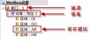 當增加了一個設備之後,該設備就自動地擁有了4個區域,分別是DI、DO、AR、HR區域。它們和Modbus命令的對應關係如下表所示: