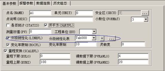 表名是分段線性化的索引,在整個數據庫係統中唯一,由字母和數字組成,最多不超過64個字符。 前qian麵mian說shuo過guo,分fen段duan線xian性xing化hua表biao是shi把ba輸shu入ru分fen成cheng若ruo幹gan段duan,每mei一yi個ge分fen隔ge點dian都dou有you一yi個ge輸shu入ru和he輸shu出chu與yu之zhi對dui應ying。因yin此ci,在zai組zu態tai時shi,要yao設she計ji其qi分fen隔ge點dian的de輸shu入ru和he輸shu出chu,在zai分fen段duan設she置zhi框kuang中zhong分fen別bie輸shu入ru合he適shi的de輸shu入ru值zhi和he輸shu出chu值zhi,點dian擊ji增zeng加jia,則ze在zai分fen段duan線xian性xing化hua表biao中zhong就jiu增zeng加jia一yi個ge分fen隔ge點dian。因yin為wei分fen段duan線xian性xing化hua對dui於yu一yi個ge輸shu入ru隻zhi能neng有you一yi個ge輸shu出chu,如ru果guo增zeng加jia時shi相xiang同tong的de輸shu入ru已yi經jing存cun在zai,則ze增zeng加jia無wu效xiao。 修改時如果當前選中了一個分隔點,則修改時隻修改當前選中分隔點的輸出值。 刪除時刪除當前表的選中的分隔點。 對於一個分段線性化表而言,最少需要有兩個分隔點。 建立一個分段線性化表之後,就可以在模擬IO點中引用了,在點表中選擇一個模擬IO點,在其基本參數頁中進行分段線性化組態:  注zhu意yi,如ru果guo要yao進jin行xing分fen段duan線xian性xing化hua,必bi須xu首shou先xian讓rang該gai點dian分fen段duan線xian性xing化hua使shi能neng。在zai分fen段duan線xian性xing化hua表biao中zhong選xuan擇ze已yi經jing組zu態tai好hao的de分fen段duan線xian性xing化hua表biao,如ru果guo沒mei有you組zu態tai,則ze點dian擊ji按an鈕niu 新增加一個分段線性化表,也可以通過點擊按鈕 對已經建立的分段線性化表進行修改。 這樣,在係統運行時,DB將自動對輸入變量進行分段線性化。