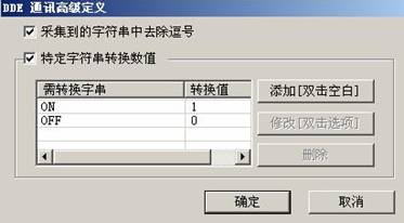 其中,采集到的字符串中去除逗號主要是針對有些DDE服務器的某些特性設置的,比如1234某些DDE服務器會傳遞1,234此時應該把逗號去除方能采集到正確的數據。特定字符串轉換數值主要是為了把采集到的特定字符串轉換為特定值時使用。比如,把ON或Open轉換為1,把OFF或Close轉換為0,注意此處的字符串是不區分大小寫的。