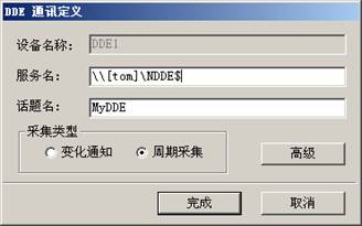 此處的服務名和話題名需要根據DDE服務器來定訪問遠程時,首先需要完成與DDE遠程訪問相關的設置,此時服務器名為:\\[ComputerName]\NDDE$,話題名為設置好的DDE共享名。
