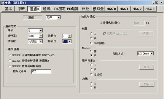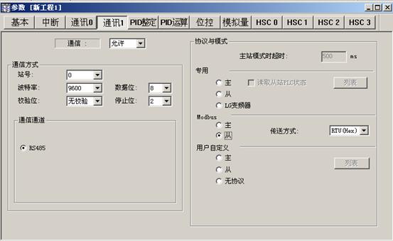 選擇“通訊0”屬性頁,將“通訊”設置為“允許”,站號設置為”0”, 通訊參數設置定9600,8,無,2 ,通訊方式選擇RS232C無調製解調器或RS422/485,協議模式選擇Modbus RTU Slave 方式,同時將“通訊1” 屬性頁中的“通訊”設置為“禁止”。