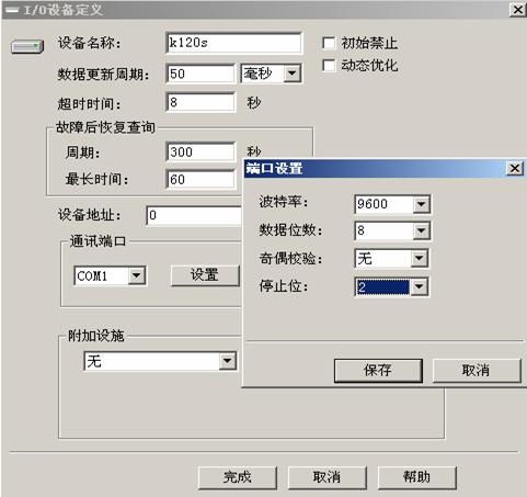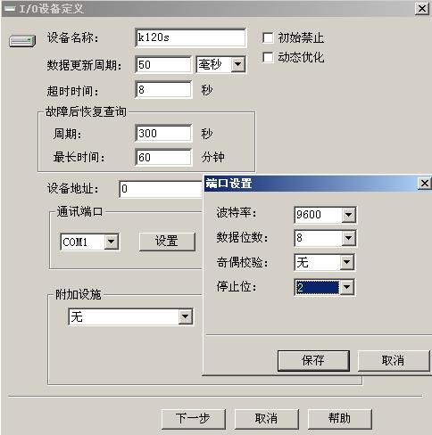 雙擊MODBUS下的“串行口通訊”彈出I/O 設備定義對話框,具體設置如圖6所示,點擊“下一步”按鈕,將彈出MODBUS設備定義對話框,具體設置如圖7所示 ,最後點擊“完成”按鈕,完成I/O設備的定義。