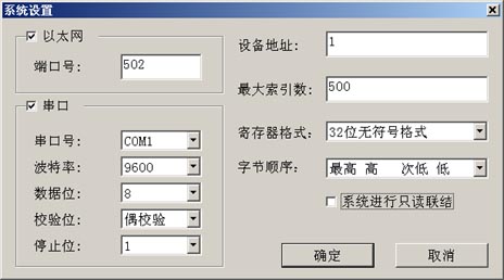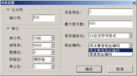 我(wo)們(men)可(ke)以(yi)看(kan)到(dao)共(gong)有(you)以(yi)太(tai)網(wang)和(he)串(chuan)口(kou)兩(liang)種(zhong)方(fang)式(shi)供(gong)選(xuan)擇(ze)使(shi)用(yong),你(ni)可(ke)以(yi)選(xuan)擇(ze)他(ta)們(men)中(zhong)的(de)一(yi)個(ge)或(huo)兩(liang)個(ge)。當(dang)選(xuan)中(zhong)以(yi)太(tai)網(wang)方(fang)式(shi)之(zhi)後(hou),必(bi)須(xu)輸(shu)入(ru)相(xiang)應(ying)的(de)端(duan)口(kou)號(hao),缺(que)省(sheng)情(qing)況(kuang)下(xia)是(shi)502端口,這是Modbus以太網協議規定的缺省端口號。當選中了串口方式後您需要選擇對應的串口並作和采集方相同的配置。
