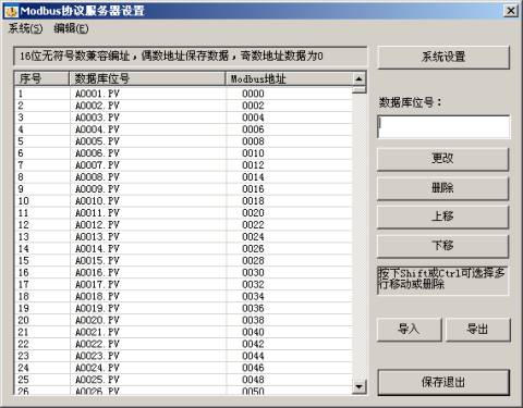 Modbus服務器支持把點表導出為文本文件,該文本文件可以在Excel中進行編輯保存後再導入,減小了組態的工作量。如果結合數據庫點組態界麵的導出到Excel編輯的功能,可以大大提高組態的速度。