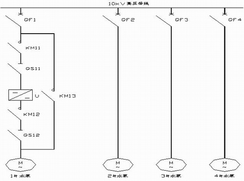 設計院和吉林市自來水集團有限公司通過工藝上認真計算,根據實際工況要求設計主回路電氣結構圖,選用HARSVERT-A型高壓變頻器一拖一的成功方案。如圖5所示。一拖一的兩台電機互為備用。