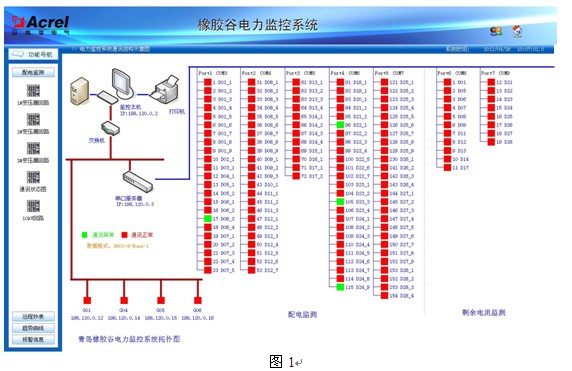 為wei滿man足zu配pei電dian室shi統tong一yi監jian控kong的de要yao求qiu,配pei電dian室shi現xian場chang安an裝zhuang安an科ke瑞rui公gong司si網wang絡luo電dian力li儀yi表biao通tong過guo屏ping蔽bi雙shuang絞jiao線xian手shou拉la手shou相xiang連lian至zhi串chuan口kou服fu務wu器qi,串chuan口kou服fu務wu器qi經jing網wang絡luo交jiao換huan機ji進jin而er傳chuan輸shu至zhi後hou台tai主zhu機ji實shi現xian對dui現xian場chang數shu據ju的de采cai集ji,存cun儲chu,處chu理li,實shi時shi顯xian示shi以yi及ji曆li史shi查zha詢xun