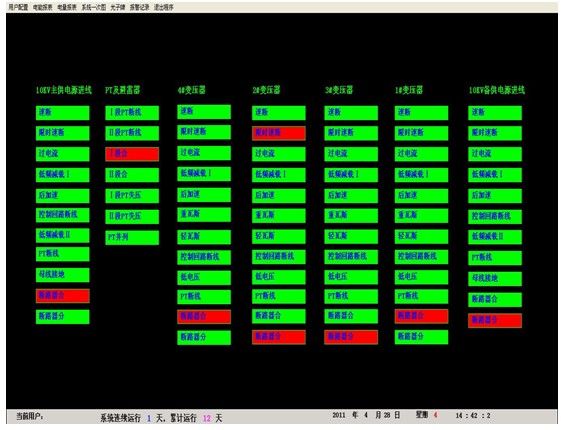 高gao壓ya一yi次ci圖tu為wei係xi統tong主zhu監jian控kong畫hua麵mian,主zhu要yao實shi時shi監jian測ce高gao壓ya回hui路lu的de運yun行xing狀zhuang態tai,重zhong要yao的de電dian參can量liang等deng。界jie麵mian上shang各ge回hui路lu一yi次ci圖tu顯xian示shi紅hong色se代dai表biao合he閘zha,綠lv色se代dai表biao分fen閘zha。