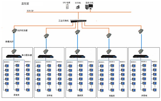 為wei滿man足zu配pei電dian室shi統tong一yi監jian控kong的de要yao求qiu,配pei電dian室shi現xian場chang安an裝zhuang安an科ke瑞rui公gong司si網wang絡luo電dian力li儀yi表biao通tong過guo屏ping蔽bi雙shuang絞jiao線xian手shou拉la手shou相xiang連lian至zhi串chuan口kou服fu務wu器qi,串chuan口kou服fu務wu器qi經jing光guang電dian轉zhuan換huan器qi後hou接jie入ru網wang絡luo交jiao換huan機ji,進jin而er傳chuan輸shu至zhi後hou台tai主zhu機ji實shi現xian對dui現xian場chang數shu據ju的de采cai集ji,存cun儲chu,處chu理li,實shi時shi顯xian示shi以yi及ji曆li史shi查zha詢xun