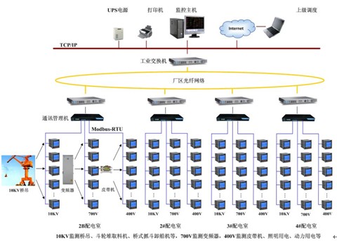 本項目四個分變內10kV配電室監控的設備為碼頭的橋吊、鬥輪堆料機、鬥輪取料機等大型設備;700V配電室監控的設備為變頻器;400V配電室監控的設備為廠區照明用電、皮帶機、維修設備等。數目都少於10個,所以12個(ge)子(zi)配(pei)電(dian)室(shi)現(xian)場(chang)隻(zhi)需(xu)各(ge)鋪(pu)設(she)一(yi)根(gen)總(zong)線(xian)即(ji)可(ke),該(gai)總(zong)線(xian)將(jiang)智(zhi)能(neng)電(dian)測(ce)儀(yi)表(biao)以(yi)菊(ju)花(hua)鏈(lian)的(de)方(fang)式(shi)連(lian)接(jie)起(qi)來(lai),然(ran)後(hou)引(yin)致(zhi)各(ge)分(fen)變(bian)的(de)網(wang)絡(luo)配(pei)置(zhi)室(shi)即(ji)可(ke)。四(si)個(ge)分(fen)變(bian)的(de)四(si)個(ge)網(wang)絡(luo)配(pei)置(zhi)室(shi)各(ge)配(pei)有(you)一(yi)個(ge)8口的通訊服務器和 yigesikedeguangduanji,peizhiwanchengzhihoujiangcaijishanglaideshujuchuanzhibangongdaloubaloujisuanjifangneidexitonghoutaijiankongzhuji。benxiangmudeyuanchengchaobiaojidiannengguanlixitonghoutaisheyougaoxingnenggongyejisuanji、顯示器、UPS電源、打印機、報bao警jing蜂feng鳴ming器qi等deng設she備bei。監jian控kong係xi統tong安an裝zhuang在zai計ji算suan機ji上shang,集ji中zhong采cai集ji顯xian示shi現xian場chang設she備bei運yun行xing狀zhuang況kuang,以yi人ren機ji交jiao互hu的de形xing式shi顯xian示shi給gei用yong戶hu,同tong時shi用yong戶hu可ke以yi通tong過guo係xi統tong軟ruan件jian發fa送song指zhi令ling至zhi現xian場chang設she備bei,實shi現xian遠yuan程cheng遙yao控kong功gong能neng。