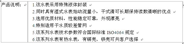 耗水量管理也是終端計量,本項目水量計量的是每個房間的冷/熱水的用量情況。本項目采用埃美柯公司的水表,具體參數如下表: