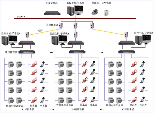 重zhong慶qing廣guang達da生sheng活huo服fu務wu區qu能neng耗hao監jian測ce係xi統tong采cai用yong網wang絡luo分fen布bu式shi結jie構gou,整zheng個ge係xi統tong包bao括kuo該gai建jian築zhu群qun七qi棟dong建jian築zhu的de七qi個ge子zi係xi統tong和he中zhong心xin監jian控kong室shi的de一yi個ge總zong監jian控kong係xi統tong。冷leng/熱re水shui表biao數shu據ju和he電dian表biao數shu據ju當dang地di采cai集ji完wan成cheng後hou傳chuan至zhi子zi係xi統tong的de監jian控kong後hou台tai進jin行xing數shu據ju分fen析xi和he存cun儲chu。之zhi後hou七qi個ge子zi係xi統tong將jiang數shu據ju轉zhuan發fa至zhi中zhong心xin監jian控kong室shi的de監jian控kong主zhu機ji。分fen控kong中zhong心xin和he中zhong心xin監jian控kong室shi之zhi間jian用yong光guang纖xian網wang絡luo進jin行xing通tong訊xun。係xi統tong實shi現xian子zi係xi統tong對dui本ben棟dong大da樓lou的de數shu據ju采cai集ji和he處chu理li,總zong係xi統tong對dui整zheng個ge建jian築zhu群qun的de能neng耗hao進jin行xing數shu據ju監jian控kong。