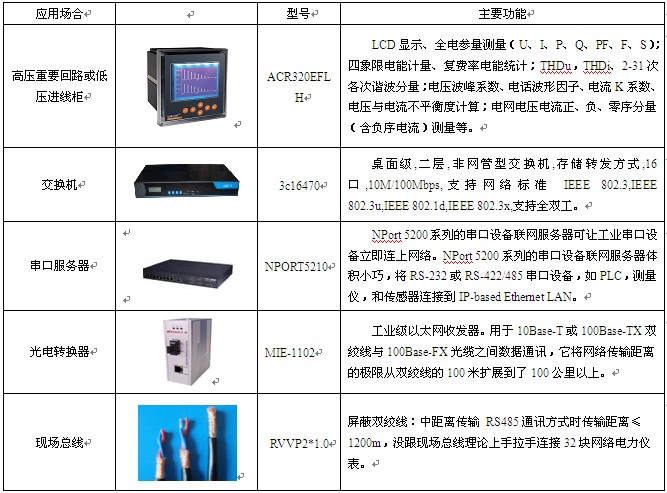 對山東電力管道工程公司提出的需求和我們確定的組網方案,現場設備層采購安科瑞公司ACR320網絡電力儀表,網絡通訊層使用華為的33c16470的網絡交換機以及MIE-1102光電轉換器,現場總線鋪設屏蔽雙絞線,以滿足係統組網的要求,具體設備如下表: