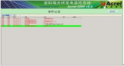 事件記錄監測畫麵 監控係統可針對光伏發電現場的各種事件進行記錄,如:通訊采集異常、開關變位、操作記錄等,時間記錄支持按類型查詢,並可對越限報警進行更改設置;