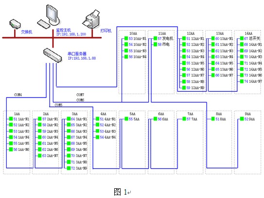 電能管理係統設於配電室隔壁的電能管理值班室,配電室內所有電力儀表均通過485總線的形式連至值班室內電能管理櫃內的智能串口服務器,最終接入電能管理主機