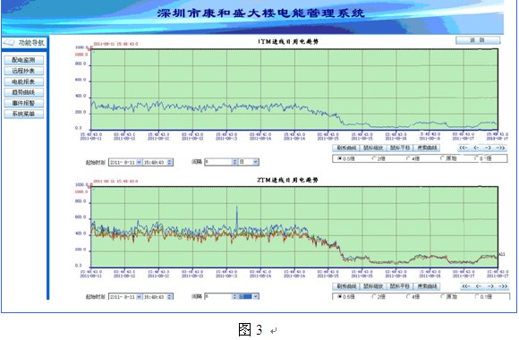 負(fu)荷(he)趨(qu)勢(shi)曲(qu)線(xian)提(ti)供(gong)了(le)某(mou)一(yi)段(duan)時(shi)間(jian)內(nei)該(gai)回(hui)路(lu)的(de)負(fu)荷(he)趨(qu)勢(shi),方(fang)便(bian)管(guan)理(li)員(yuan)掌(zhang)握(wo)用(yong)電(dian)設(she)備(bei)的(de)運(yun)行(xing)狀(zhuang)況(kuang),通(tong)過(guo)對(dui)曆(li)史(shi)數(shu)據(ju)的(de)分(fen)析(xi),可(ke)為(wei)今(jin)後(hou)新(xin)增(zeng)部(bu)門(men)和(he)設(she)備(bei)提(ti)供(gong)科(ke)學(xue)的(de)用(yong)電(dian)量(liang)估(gu)算(suan);通過分析大樓內每個設備的用電量和設備的品牌、型號、使用年限等設備詳細信息來評估設備用電是否合理;通過大樓內各部門用電同比、環比的報表分析,得出各設備用電是否合理;對某一節能設備或技術在使用一定時間後,評測的節能效率是否與當初的預計一致。用電趨勢如圖3所示: