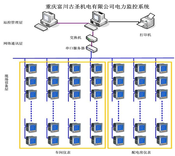 重慶富川機電有限公司是中國生產汽車、摩托車及通用機械電裝品和齒輪的知名品牌企業。地處重慶市九龍坡區白市驛工業園區,總占地麵積60餘畝,廠房麵積近4萬平方米,擁有員工近1000人。重慶富川古聖機電有限公司是重慶富川在北碚的一個分公司,2011年剛投產。由於本身是一個生產型的企業,車間的用電設備基本上是大功率電機,單個三相回路電流大的時候能夠達到400多A,設備的價格都比較昂貴。為了更加便利地對公司員工的作業情況進行管理和用電設備運行狀況的掌控,以便在節能降耗的同時提高生產效率,重慶富川於2011年初購買了上海安科瑞電氣股份有限公司的Acrel-2000型電力監控係統。