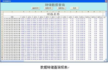 為了滿足該企業ERP係統對電力參數作進一步的加工分析,Acrel-2000型電力監控係統還提供了數據轉存功能,即將Acrel-2000電力監控係統數據庫中的數據轉存到相鄰主機SQL 2008數據庫中,以便用戶對這個企業的用電數據進行操作,而且在本機上可以查詢出任何時刻轉出的數據,報表窗口如圖示: