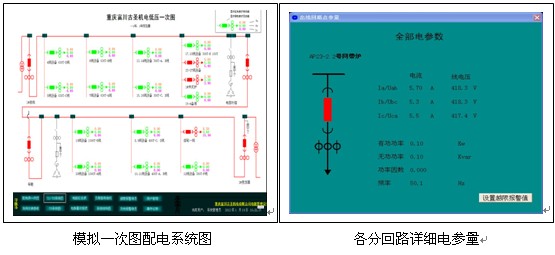 模擬一次圖配電係統圖從(cong)圖(tu)上(shang)可(ke)以(yi)直(zhi)接(jie)看(kan)出(chu)該(gai)具(ju)體(ti)回(hui)路(lu)的(de)合(he)分(fen)閘(zha)情(qing)況(kuang),綠(lv)色(se)表(biao)示(shi)分(fen)閘(zha),紅(hong)色(se)表(biao)示(shi)合(he)閘(zha)。鼠(shu)標(biao)左(zuo)鍵(jian)點(dian)擊(ji)某(mou)個(ge)具(ju)體(ti)的(de)一(yi)次(ci)回(hui)路(lu)時(shi),監(jian)控(kong)軟(ruan)件(jian)將(jiang)彈(dan)出(chu)該(gai)回(hui)路(lu)的(de)詳(xiang)細(xi)電(dian)參(can)量(liang)。