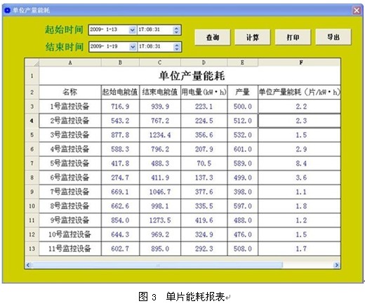 3.3.2 係統功能 整個係統實現了對一期配電房和二期配電房所有回路電能的采集和統計,遠程自動抄表、電能統計等功能,包括: a. 遠程電量參數測量,包括實時電能、分攤電能、總電能以及按各監控設備統計電能。 b. 運行狀態監測,通訊異常報警提示。 c. 用戶管理,不同用戶權限具備不同操作功能,各級權限具有口令修改操作功能和權限防誤功能。 d. 電能報表,實現了所有電能報表的按時間查詢,分為分鍾、小時、班組、日、月五種類型,包括總、尖、峰、平、穀複費率電能及用電量。 e. 電能柱形圖,任意回路電能實時電能柱形圖顯示,包括總、尖、峰、平、穀電能。 f. 彙總表,所有監控設備電能彙總,按時間段查詢,自動計算任意時段用電量。 g. 單位能耗,自動計算單位產量能耗,並可打印及導出。單位產量能耗計算界麵如圖3所示。 h. 打印及導出,所有報表及界麵均可打印,或以EXCEL、WORD格式導出。