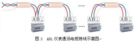 儀表之間采用屏蔽雙絞線進行總線型連接,通過通訊擴展卡進入監控主機。圖2所示為ADL儀(yi)表(biao)通(tong)訊(xun)電(dian)纜(lan)接(jie)線(xian)示(shi)意(yi)圖(tu)。通(tong)過(guo)對(dui)配(pei)電(dian)係(xi)統(tong)的(de)二(er)次(ci)設(she)備(bei)進(jin)行(xing)組(zu)網(wang),經(jing)由(you)通(tong)訊(xun)網(wang)絡(luo)到(dao)達(da)監(jian)控(kong)主(zhu)機(ji),將(jiang)分(fen)散(san)的(de)配(pei)電(dian)所(suo)的(de)現(xian)場(chang)設(she)備(bei)連(lian)接(jie)為(wei)一(yi)個(ge)整(zheng)體(ti)。
