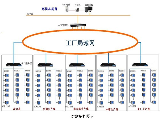 整(zheng)個(ge)係(xi)統(tong)采(cai)用(yong)網(wang)絡(luo)分(fen)布(bu)式(shi)結(jie)構(gou),網(wang)絡(luo)拓(tuo)撲(pu)結(jie)構(gou)如(ru)下(xia)圖(tu)。監(jian)控(kong)主(zhu)機(ji)位(wei)於(yu)辦(ban)公(gong)樓(lou)二(er)樓(lou)的(de)環(huan)境(jing)品(pin)質(zhi)檢(jian)測(ce)部(bu),數(shu)據(ju)采(cai)集(ji)主(zhu)要(yao)劃(hua)分(fen)為(wei)三(san)個(ge)區(qu),洗(xi)衣(yi)機(ji)生(sheng)產(chan)回(hui)路(lu)設(she)備(bei)、冰箱生產回路設備和老廠空調生產回路設備。電力儀表的通訊為485總線結構,將信號通過屏蔽雙絞線傳輸到數據采集器,數據采集器連入廠區的局域網中。