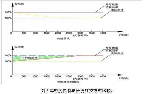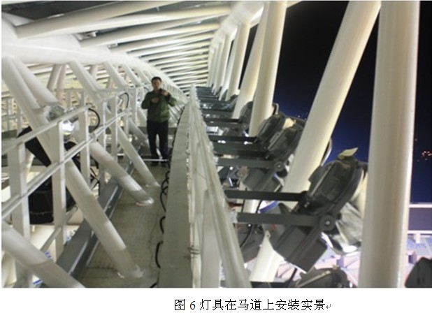 通過按照不同的配光曲線組合,按光衰周期開啟不同數量的燈具,實現等照度控製,以節約電能,比較結果如圖3所示。按初始光通量100%到維持光通量70%進行計算共3 000 h,從初始光通量每5%(即每500 h),fenwujimoshizhaoming,shezhikaidengmoshijinxingkongzhi,tongshidianlijiankongxitongdui毎zhandengdekaidengshijianjinxingjilu,anzuiyoufangshikongzhi毎zhandengdezongkaidengshijian,zuodao480盞燈具壽命同期,避免傳統的賽場照明控製方式使個別燈組的燈具開燈時間過長,提前老化,延長了賽場照明的整體換燈周期,布燈方案如圖4所suo示shi。為wei保bao證zheng恒heng照zhao度du模mo式shi下xia的de賽sai場chang照zhao明ming均jun勻yun度du,照zhao明ming設she計ji軟ruan件jian進jin行xing了le大da量liang的de模mo擬ni計ji算suan,優you化hua出chu最zui佳jia的de燈deng具ju組zu合he,同tong時shi設she置zhi要yao求qiu在zai毎毎盞zhan燈deng上shang配pei置zhi對dui光guang裝zhuang置zhi,可ke按an方fang便bian地di調tiao整zheng毎毎盞zhan燈deng的de靶ba心xin,以yi保bao證zheng賽sai場chang的de照zhao度du均jun勻yun。燈deng具ju安an裝zhuang如ru圖tu5、圖6所示。