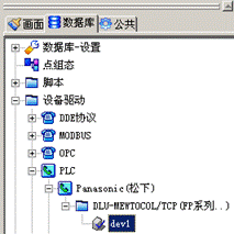 設備驅動組態: 首先,在紫金橋開發係統的“數據庫”選項卡中,展開節點“設備驅動-〉PLC-〉Panasonic(鬆下)”,然後雙擊“DLU-MEWTOCOL/TCP(FP係列..)”,在彈出的“I/O設備定義”對話框中填寫基本的設備通訊參數,如下圖: