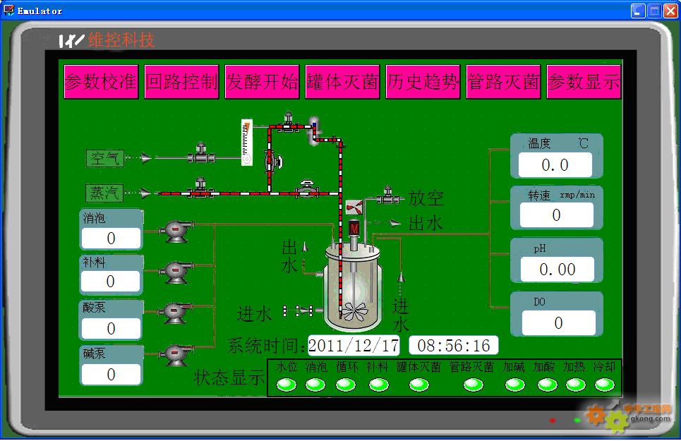 ・ 對發酵罐中主要的變量和生物量(如攪拌轉速、培養液溫度、發酵液pH值、溶解氧濃度值等)進行在線測量,對菌體濃度、產物濃度和基質濃度等間接參數進行在線計算,實時監控各個閥門狀態、電機狀態;