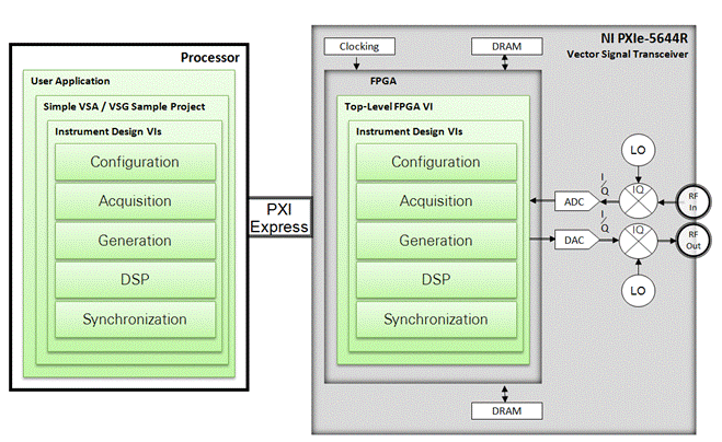 圖2. NI PXIe-5644R矢量信號收發器的架構可允許在主機或設備固件中仿真和部署用戶可編輯的DSP塊。同時也可以對其他輸入/輸出以及內存接口進行修改以作為算法設計的補充。