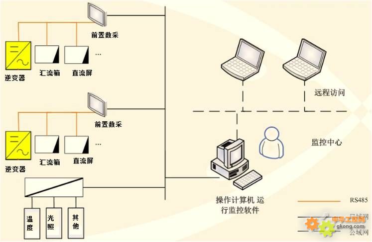 本光伏電站監控係統將光伏電站的逆變器、彙流箱、氣象儀、電表等設備通過數據線連接起來,用光伏電站數據采集器進行這些設備的數據采集,並通過GPRS、以太網、WIFI等(deng)方(fang)式(shi)上(shang)傳(chuan)到(dao)網(wang)絡(luo)服(fu)務(wu)器(qi)或(huo)本(ben)地(di)電(dian)腦(nao),使(shi)用(yong)戶(hu)可(ke)以(yi)在(zai)互(hu)聯(lian)網(wang)或(huo)本(ben)地(di)電(dian)腦(nao)上(shang)查(zha)看(kan)相(xiang)關(guan)數(shu)據(ju),方(fang)便(bian)電(dian)站(zhan)管(guan)理(li)人(ren)員(yuan)和(he)用(yong)戶(hu)對(dui)光(guang)伏(fu)電(dian)站(zhan)的(de)運(yun)行(xing)數(shu)據(ju)查(zha)看(kan)和(he)管(guan)理(li)。