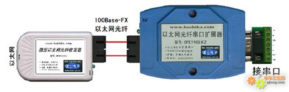 以太網光纖/串口擴展器的典型應用為:遠端的OPET485KZ型(接串口設備)和近端OPET100L型(接計算機或者以太網HUB的RJ-45口),中間通過光纖連接。遠端OPET485KZ型的串口為1個DB-9針座,接RS-232/485/422設備,產品需要5V供電。近端OPET100L型的以太網口接計算機或者HUB的以太網,5V供電。遠端OPET485KZ型與近端OPET100L型之間用2根SC頭光纖相連,注意這2個光口必須交叉連接。先通過OPET100L將以太網通過光纖延長到遠端,然後將遠端的以太網光口(100Base- FX)通過OPET485KZ轉換成為串口,這樣就通過光纖在遠端擴展出了串口。