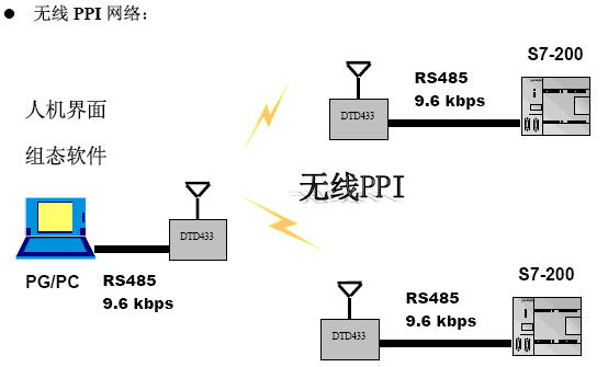 本方案是組態軟件與兩台西門子S7-200進行無線PPI通信的實現方法。此方案可以作為西門子S7-200與組態軟件的無線PPI通信案例。在本方案中采用了專門用於無線PPI通信的智能數據終端DTD433M係列產品。