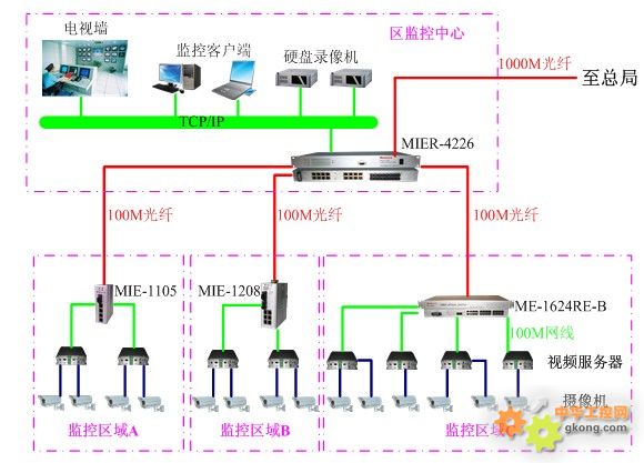 在不同的監控區域,選擇使用不同的交換設備,如在視頻服務器不多地區域使用5端口或8端口交換機,而在視頻服務器數量較多的區域使用16或24端口交換機,並使用交換機的光纖接口使用專用光纜傳輸至區監控中心,由MIER-4226全光口光纖交換機對數據進行彙聚,由MIER-4226交換機的1000M網絡接口傳輸至硬盤錄像機和電視牆。而至總局的傳輸則使用MIER-4226的1000M光纖接口來實現。