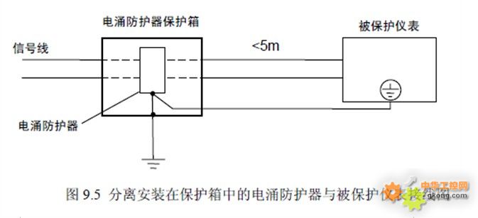分離安裝的電湧防護器與被保護儀表之間的接線長度不得超過5m,接地端子應就近接地。圖9.5 為分離安裝在保護箱中的電湧防護器與被保護儀表接線示意圖。