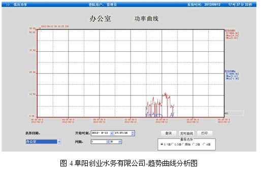 係統提供了實時曲線和曆史趨勢兩種曲線分析接口,通過調用相關回路實時曲線接口分析該回路當前的負荷運行狀況。如通過調用某配出回路的實時曲線可分析該回路的電氣設備所引起的信號波動情況。係統的曆史趨勢即係統對所有已存儲數據均可查看其曆史趨勢,方便工程人員對監測的配電網絡進行質量分析。