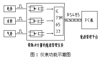 儀表具備三相多功能電能表、脈衝采集器二合一的功能。除可測量常用電力參數及實現電能計量外, 還具備3 路外部輸入脈衝計量功能,可對基於脈衝電路技術的計量表進行信號采集、運算處理、存儲,並與儀表自身測量的電參數一起通過 RS485 總線上傳至能源管理平台, 其示意圖如圖1 所示。
