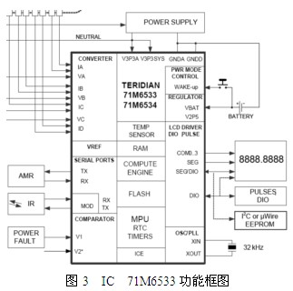 儀表選用專用於三相多功能電表解決方案的 SOC , TERIDIAN Energy Meter IC 71M6533 (見圖 3 )。此芯片集電能計量和管理於一體,配備了 1 個高精度的 22 位 Δ - Σ ADC、7個模擬輸入、數字溫度補償、精密參考電壓和獨立的32位計算引擎, 在超過 2000:1 範圍內計量精度優於 0.1% 。