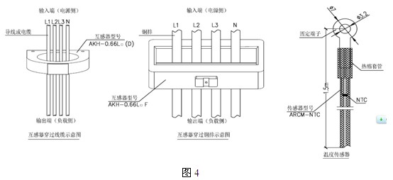 3)剩餘電流和溫度傳感器穿線示意圖。剩餘電流互感器的額定電流等級,應大於或等於配電回路保護電器的整定電流值,實際應用中應確保所有線纜或銅排穿過互感器;.溫度傳感器為一熱敏電阻NTC,它提供-10℃-120℃的溫度監控基準,可以用來監測線纜或配電箱內的溫度,提供溫度保護,如圖4所示