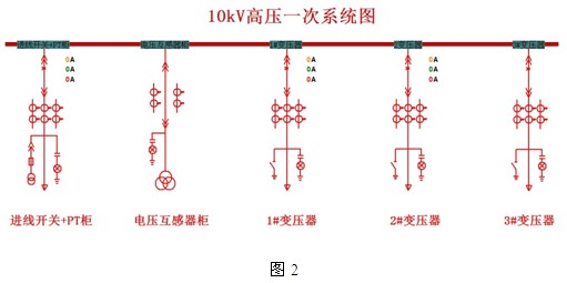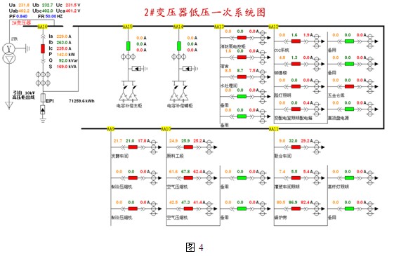 4.2配電係統一次示意圖: 10kV和0.4kV配電室配電回路運行狀態使用一次圖形式顯示回路的電壓,三相電流、有功無功功率、功率因數和頻率,界麵如下圖2、3、4所示: