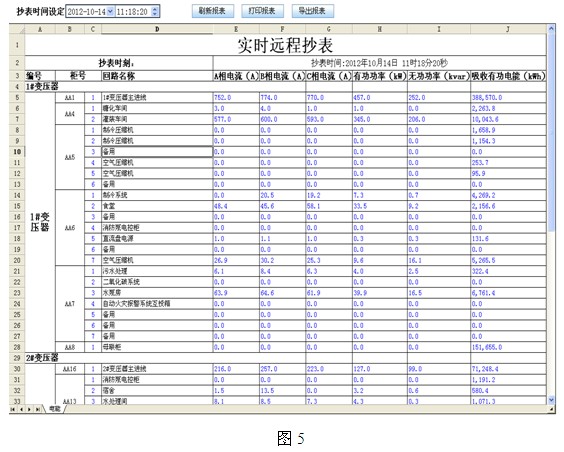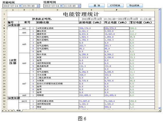 4.3報表功能:通過報表功能可以查詢任意時刻回路的全常規電參量數據、回路的用電量。用戶主要關注的是用電量報表,用電量報表用於電費計量以及與核對後進行成本核算,如下圖5、6所示;