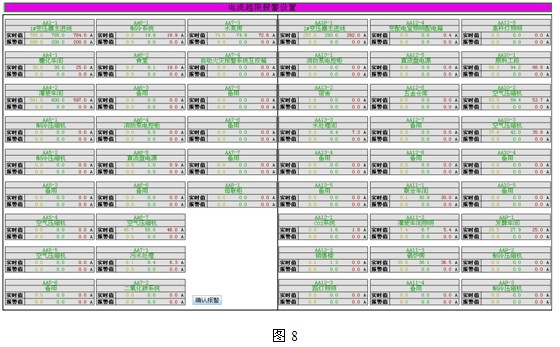 4.5 電流越限報警設置:電力監控係統定義了電流越限報警設置界麵,用戶根據各個回路現場線纜的橫截麵(粗細)決定設定電流預警值,避免電流過大造成用電事故發生。如下圖8所示: