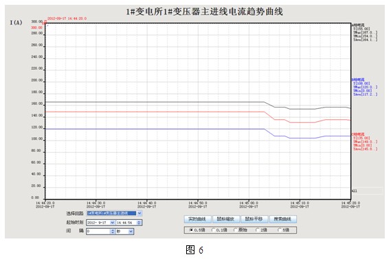 4.3趨勢曲線:Acrel-2000電(dian)力(li)監(jian)控(kong)係(xi)統(tong)提(ti)供(gong)了(le)實(shi)時(shi)曲(qu)線(xian)和(he)曆(li)史(shi)趨(qu)勢(shi)兩(liang)種(zhong)曲(qu)線(xian)的(de)分(fen)析(xi)界(jie)麵(mian),通(tong)過(guo)調(tiao)用(yong)相(xiang)關(guan)回(hui)路(lu)實(shi)時(shi)曲(qu)線(xian)界(jie)麵(mian)分(fen)析(xi)該(gai)回(hui)路(lu)當(dang)前(qian)的(de)負(fu)荷(he)運(yun)行(xing)狀(zhuang)況(kuang)。如(ru)通(tong)過(guo)調(tiao)用(yong)某(mou)配(pei)出(chu)回(hui)路(lu)的(de)實(shi)時(shi)曲(qu)線(xian)可(ke)分(fen)析(xi)該(gai)回(hui)路(lu)的(de)電(dian)氣(qi)設(she)備(bei)所(suo)引(yin)起(qi)的(de)信(xin)號(hao)波(bo)動(dong)情(qing)況(kuang)。係(xi)統(tong)的(de)曆(li)史(shi)趨(qu)勢(shi)即(ji)係(xi)統(tong)對(dui)所(suo)有(you)已(yi)存(cun)儲(chu)數(shu)據(ju)均(jun)可(ke)查(zha)看(kan)其(qi)曆(li)史(shi)趨(qu)勢(shi),方(fang)便(bian)工(gong)程(cheng)人(ren)員(yuan)對(dui)監(jian)測(ce)的(de)配(pei)電(dian)網(wang)絡(luo)進(jin)行(xing)質(zhi)量(liang)分(fen)析(xi)。如(ru)下(xia)圖(tu)6所示。