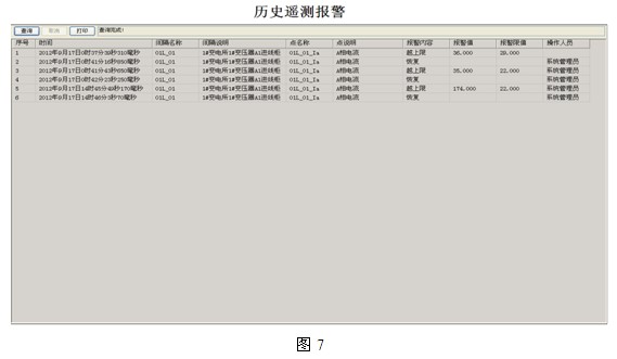 4.4事故報警和追憶:電力監控係統定義了所有配電回路過負荷及開關量變位實時報警和曆史報警查詢等功能,如下圖7所示,列表中列出報警發生和恢複的時間、回路名稱、回路編號、數據點、報警內容和報警值等數據。
