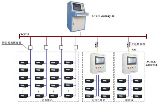 本工程共分為 3 個監控區域,分別為航食區、汙水處理站以及動力中心。其中航食區及汙水處理站現場監測回路較少,分別為 24 及 38 個監控回路,動力中心共計 96 個監控回路,本工程在配電櫃現場均安裝 ARCM200 係列剩餘電流監控探測器及 AKH-0.66/L 型剩餘電流互感器。在航食區及汙水處理站管理層配置 AcrelAcrel-6000/B50 壁掛式電氣火災監控係統;在動力中心設立琴台式電氣火災監控係統 Acrel-6000/Q100 。三(san)個(ge)電(dian)氣(qi)火(huo)災(zai)監(jian)控(kong)係(xi)統(tong)在(zai)地(di)理(li)上(shang)分(fen)布(bu)於(yu)三(san)個(ge)管(guan)理(li)區(qu)域(yu),每(mei)套(tao)係(xi)統(tong)又(you)通(tong)過(guo)局(ju)域(yu)網(wang)組(zu)成(cheng)一(yi)個(ge)有(you)機(ji)的(de)整(zheng)體(ti),將(jiang)各(ge)處(chu)的(de)漏(lou)電(dian)及(ji)溫(wen)度(du)信(xin)息(xi)進(jin)行(xing)共(gong)享(xiang),便(bian)於(yu)機(ji)場(chang)工(gong)作(zuo)人(ren)員(yuan)進(jin)行(xing)統(tong)一(yi)管(guan)理(li)。