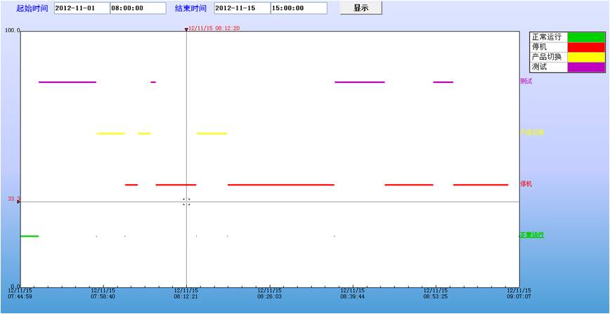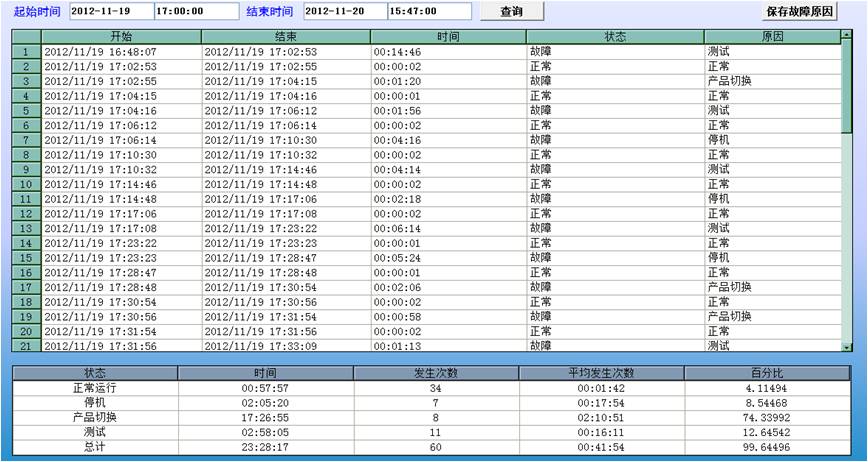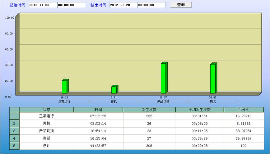 生產狀態報表:能夠查詢某一時間範圍內的各種狀態發生的起始時間,並按狀態類型給出全局對比,給出某一狀態在該時間段內發送的總時間、發送的次數、平均發生時間和時間的百分比對比。