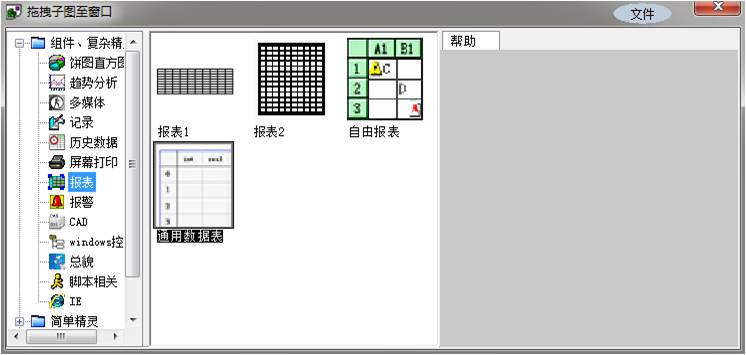 創建通用數據表:打開“拖拽子圖到窗口/組件、複雜精靈/報表/通用數據表”。如下圖: