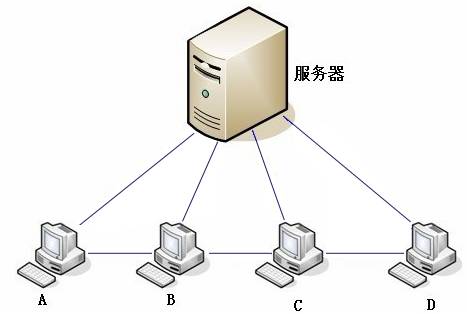 首先給大家簡單的介紹一下腈綸廠項目某車間的操作流程,它的現場是有5台電腦,A,B,C,D和服務器Server。其中B,C,D是生產數據,然後通過SQL Server的存儲過程功能把數據上傳到服務器,A機的主要作用就是按照條件查詢B,C,D每天生產的數據然後生成報表。下麵是此車間的網絡示意圖:
